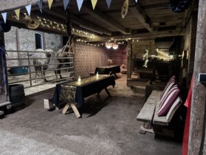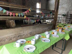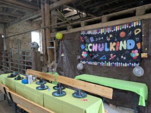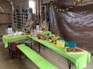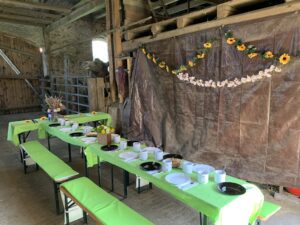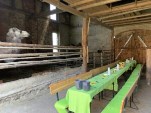 In der Kamelstube finden bis 20 Personen bequem Platz, auf Wunsch erweitern wir auf die Stallgasse, hier können noch 25 weitere Gäste Platz finden.